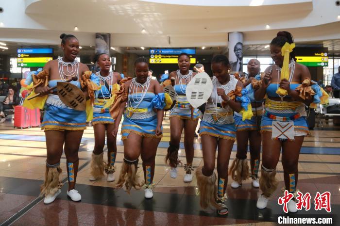 当地时间9月20日,搭乘国航航班的10名中国游客顺利抵达南非城市约翰内斯堡。值得一提的是,这是中国自8月进一步恢复出境团队旅游后,首批从北京出发抵达南非的中国旅行团。图为当地民众通过民族歌舞的方式欢迎中国游客的到来。记者 王曦 摄