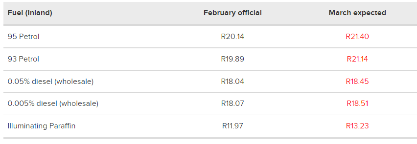 Engen销售和分销公司East Cape Fuels提供的月中燃油价格数据显示,3月份南非将迎来大幅上涨的燃油价格。