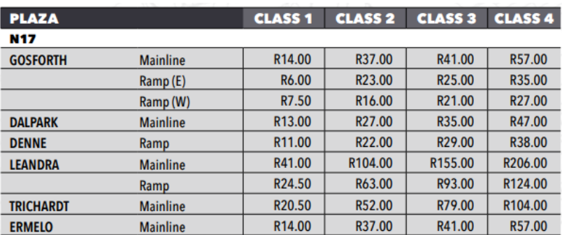 更新后的费用,如南非国家公路局(Sanral)的费用手册中所述,如下所示。
