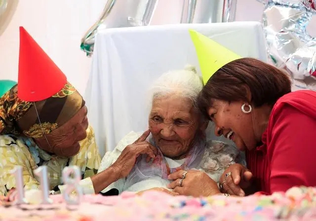 9月27日,在南非陶斯勒菲,118岁老人玛格丽特·马里茨(中)在生日庆祝活动上与她两个女儿在一起。新华社/法新