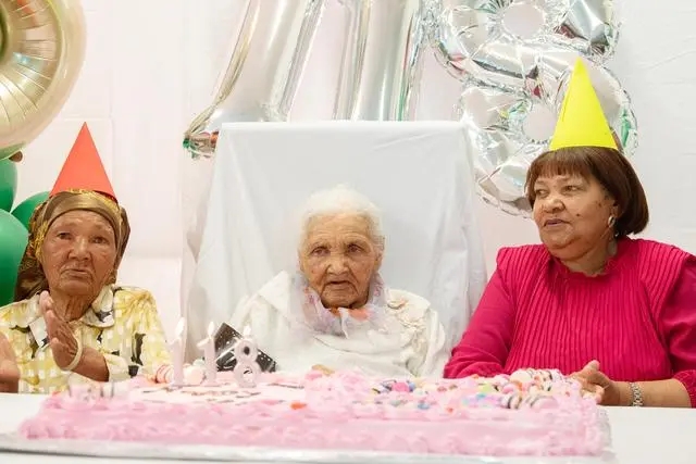 9月27日,在南非陶斯勒菲,118岁老人玛格丽特·马里茨(中)在生日庆祝活动上。新华社/法新