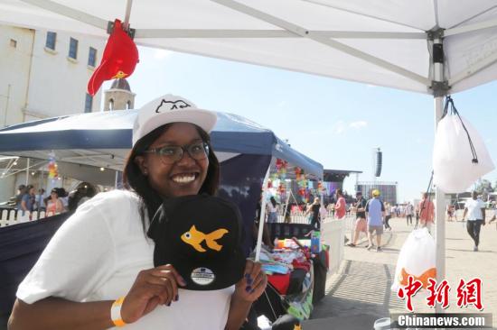 当地时间12月14日,作为南非最具知名度的音乐节之一,2019年“金鱼”户外音乐节在南非约翰内斯堡举行。图为演出现场观众手拿印有“金鱼”户外音乐节标志的帽子。