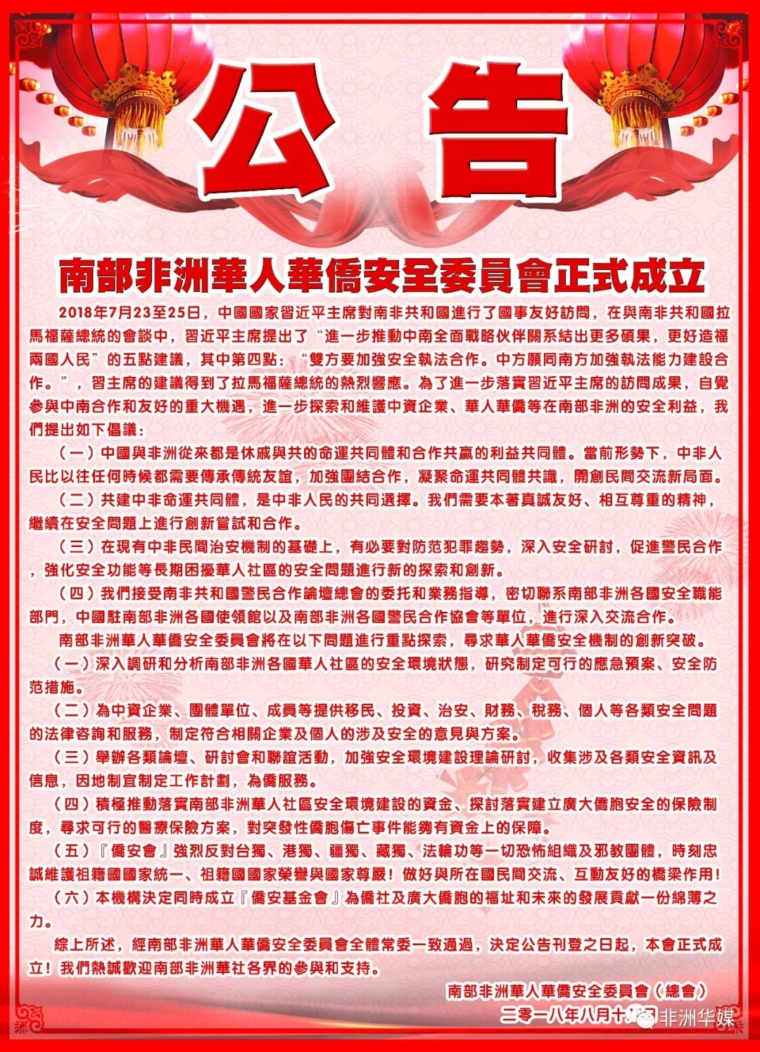 公告:南部非洲华人华侨安全委员会正式成立