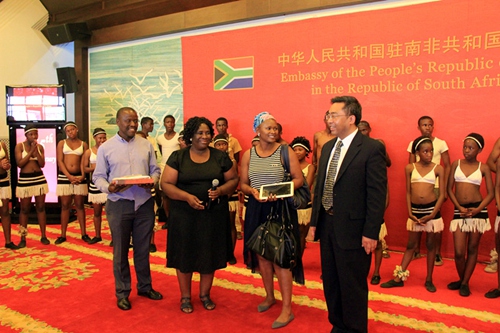 国庆招待会现场,中国驻南非大使馆临时代办杨义瑞向参加活动的南非西北省拉莫科卡斯泰德青少年传统艺术团捐赠书籍和舞蹈服装,以表示对南非传统文化遗产的支持。