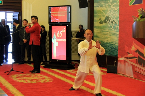人民网比勒陀利亚9月24日电 (记者 张建波)为庆祝中华人民共和国成立65周年,中国驻南非大使馆9月23日在南非行政首都比勒陀利亚举行国庆招待会。中国驻南非大使馆临时代办杨义瑞、南非小企业发展部部长祖卢、联合执政和传统事务部副部长巴佩拉、总统府副部长马纳梅拉、南非前总统曼德拉的女儿玛基等来自南非政府、议会、企业、学术界、媒体等各界人士、多国驻南非使节以及南非中资机构和华侨华人代表400余人应邀出席活动。