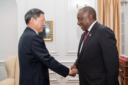 拉马福萨感谢习近平主席派高级别特使出席其就职仪式,并请郝明金转达他对习近平主席的亲切问候。拉马福萨表示,南中关系特殊,我和习近平主席都肩负着让本国人民过上更美好生活的使命,期待同习近平主席共同谋划和开创两国关系新时代。