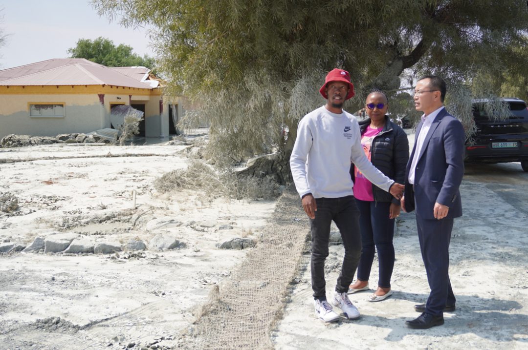 9月15日,周副总领事走访灾民救助点,了解人员伤亡、财产损失、后续安置等情况,并向灾民发放食物包、毛毯等物资。自由州省分管公共工程和基础设施的副省长克洛伊(Motshidisi Koloi)、科帕农市市长赛勒赛勒(Xolani Tseletsele)陪同。灾民纷纷感谢总领馆的倾情相助,表示在痛苦绝望之际感受到了来自中国兄弟家人般的温暖。