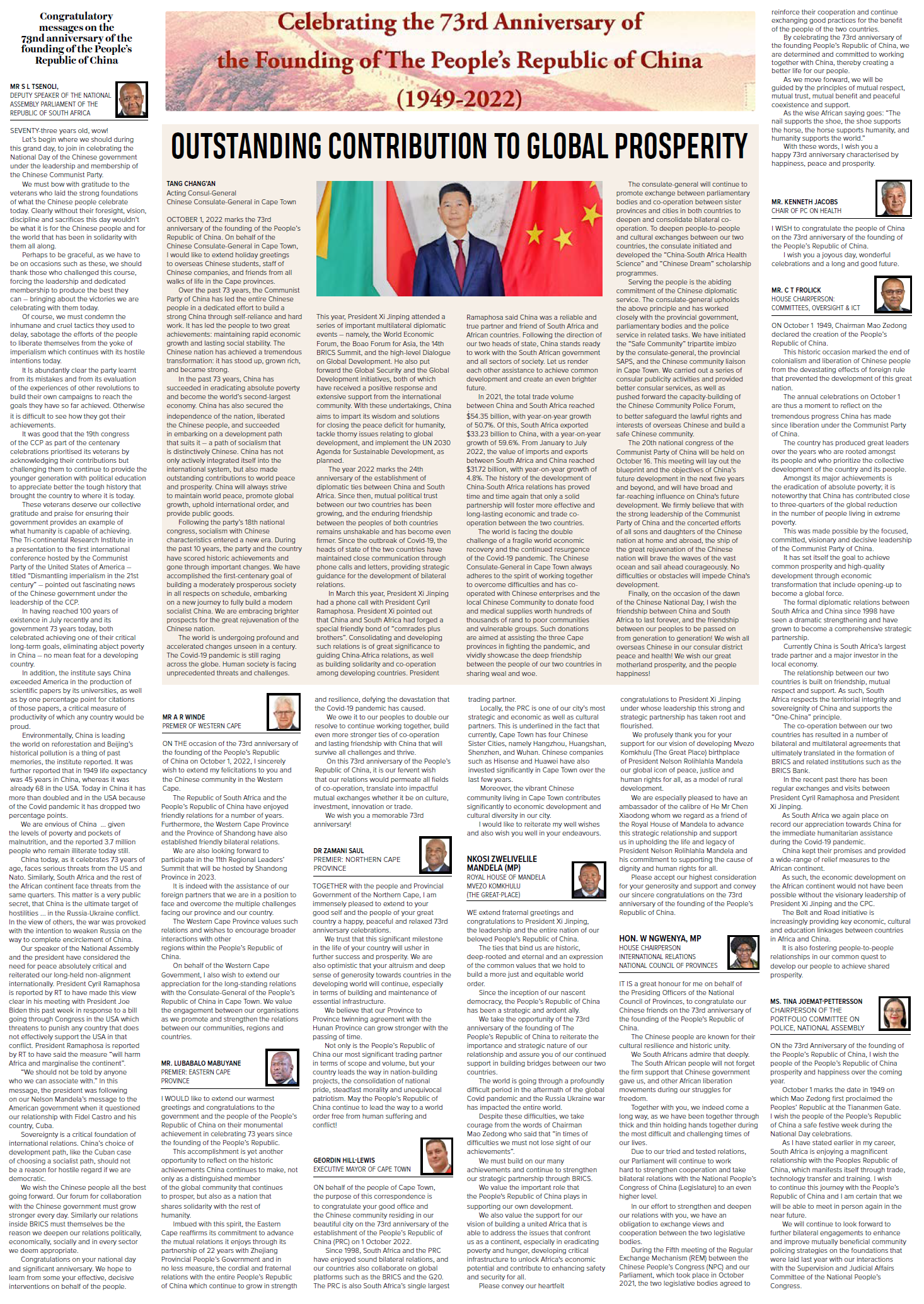 专版还刊载了南非国民议会副议长茨诺里、议会事务主席弗罗里克、省务院议会事务主席恩格温娅、国民议会农业委员会主席曼德拉、健康委员会主席杰考布、警察委员会主席彼得森、西开普省省长温迪、北开普省省长苏尔、东开普省省长马布亚尼、开普敦市执行市长希尔-刘易斯发来的贺信贺词。 南非议会及领区开普三省省市政府高层对新中国成立73周年表达衷心祝贺,盛赞73年来中国经济社会取得的举世瞩目的成就,高度评价习近平主席带领中国高举多边主义旗帜,推动构建人类命运共同体的努力,肯定中国政府统筹疫情防控和经济社会发展取得的显著成果,表示南方将继续同中方在金砖国家、二十国集团、77国集团等框架下深化合作,造福南中两国及两国人民。