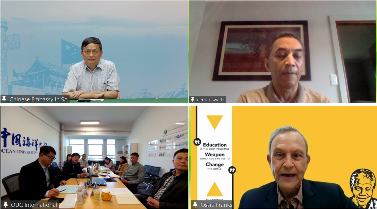 南非纳尔逊曼德拉大学奥斯·弗兰克斯教授、中国海洋大学国际合作处李卫东处长以及来自两校共十余名海洋领域专家参加视频会。