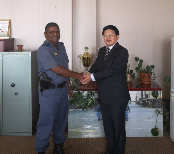 Perumal局长祝贺中国共产党二十大的胜利召开,他欢迎唐中东总领事一行的到来,他表示约堡市在全南非是最具经济活力的,商城区周边是南非人流量最大的区域,社会治安压力很大。他表示商城区华人社区与警局一直保持良好的合作关系,将全力保护在商城区合法经营的中国企业和人员的安全,今后还会推出系列行动计划,愿继续与总领馆保持良好协调配合,为在商城区地区的中国公民提供更好的安全保障。