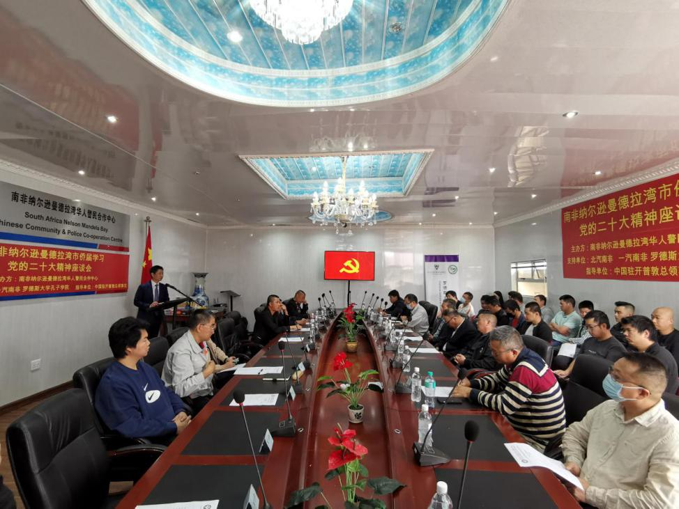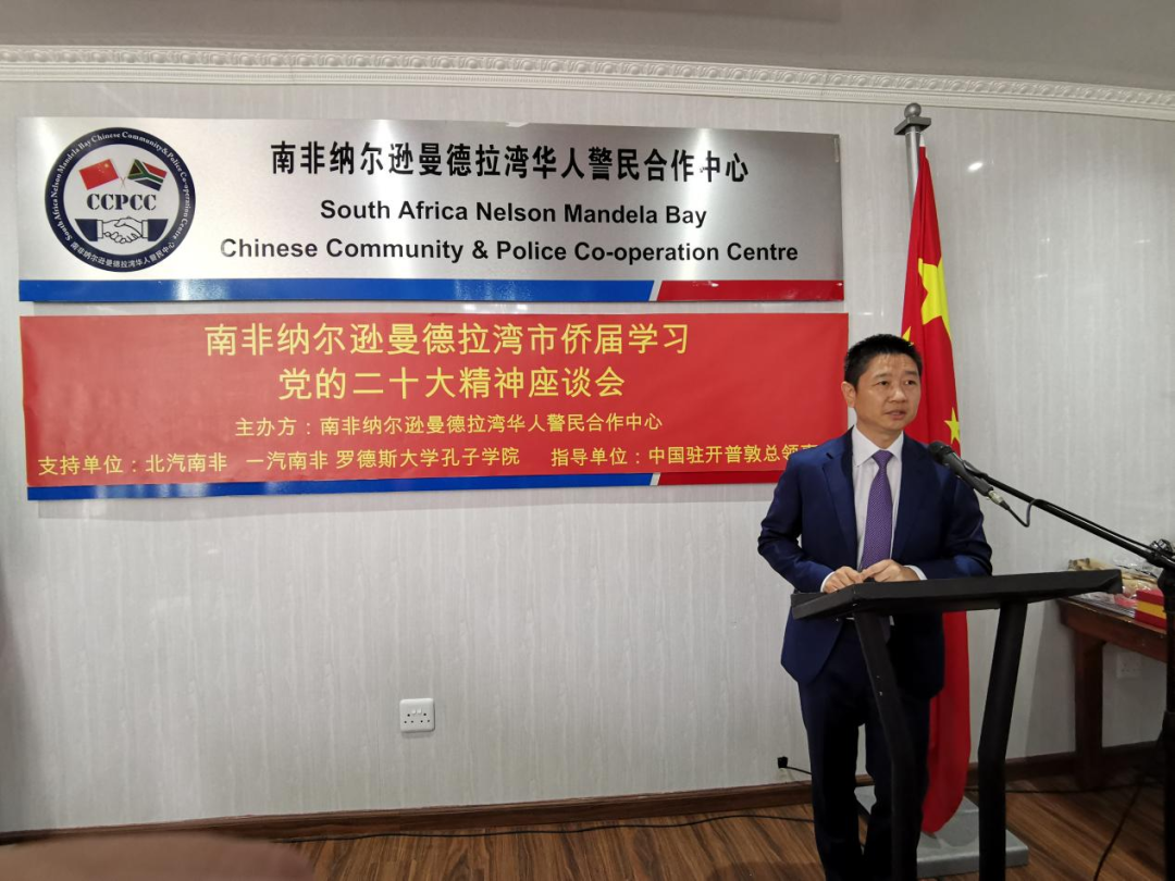 2022年11月10日,汤长安代总领事出席东开普省纳尔逊·曼德拉湾市侨界学习二十大精神座谈会,来自华人警民合作中心、北汽南非公司、一汽南非公司、罗德斯大学孔子学院、侨界代表等40多人参加,纳尔逊·曼德拉湾市华人警民中心执行长张杰主持座谈会。