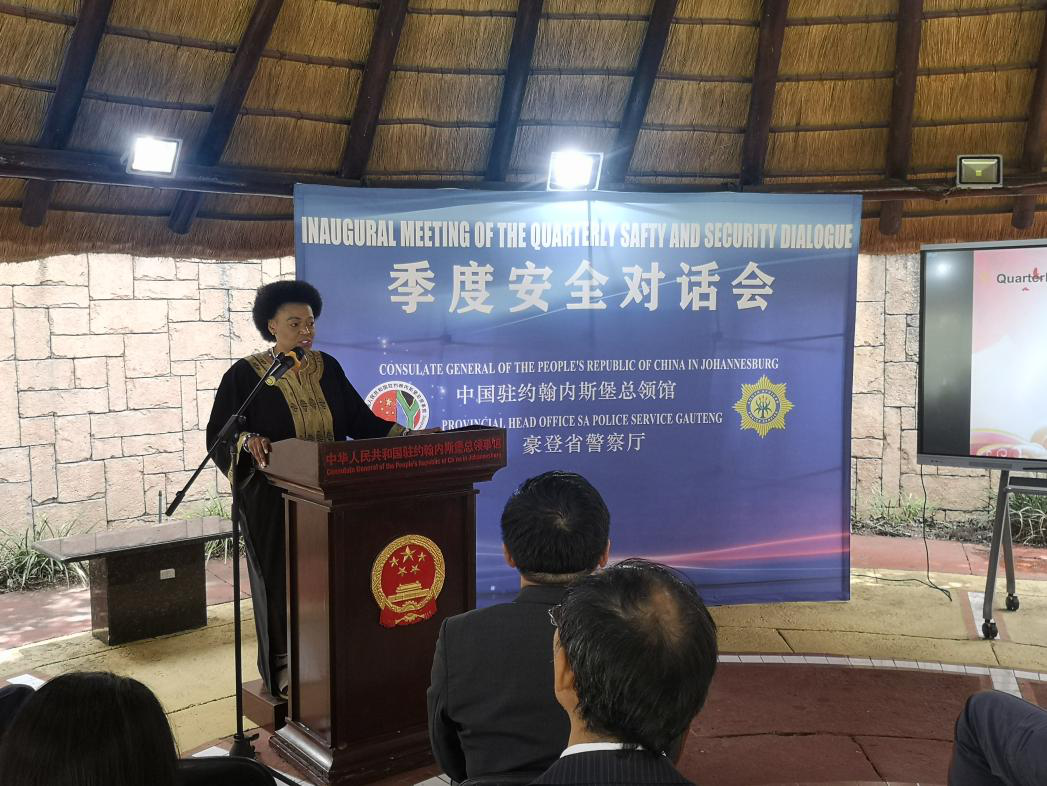 为进一步做好领区中国公民和法人合法权益保护工作,12月19日,驻约翰内斯堡总领馆与豪登省警察厅举办首次季度安全对话会。驻约翰内斯堡总领事唐中东、豪登省警察厅副厅长Mthombeni少将、豪登省社区安全厅厅长Montsikelelo Sisulu女士等出席并发表讲话,负责西南商城区的约堡中央警局局长Brigadier Perumal、负责桑顿地区的桑顿警局局长Brigadier Moodley、负责西罗町唐人街的克利夫兰警局局长Colonel Motaung、南非华人警民合作中心、南中经贸协会、豪登省警民合作论坛(South Africa Community Policing Forum, Gauteng)代表等约40人参加。