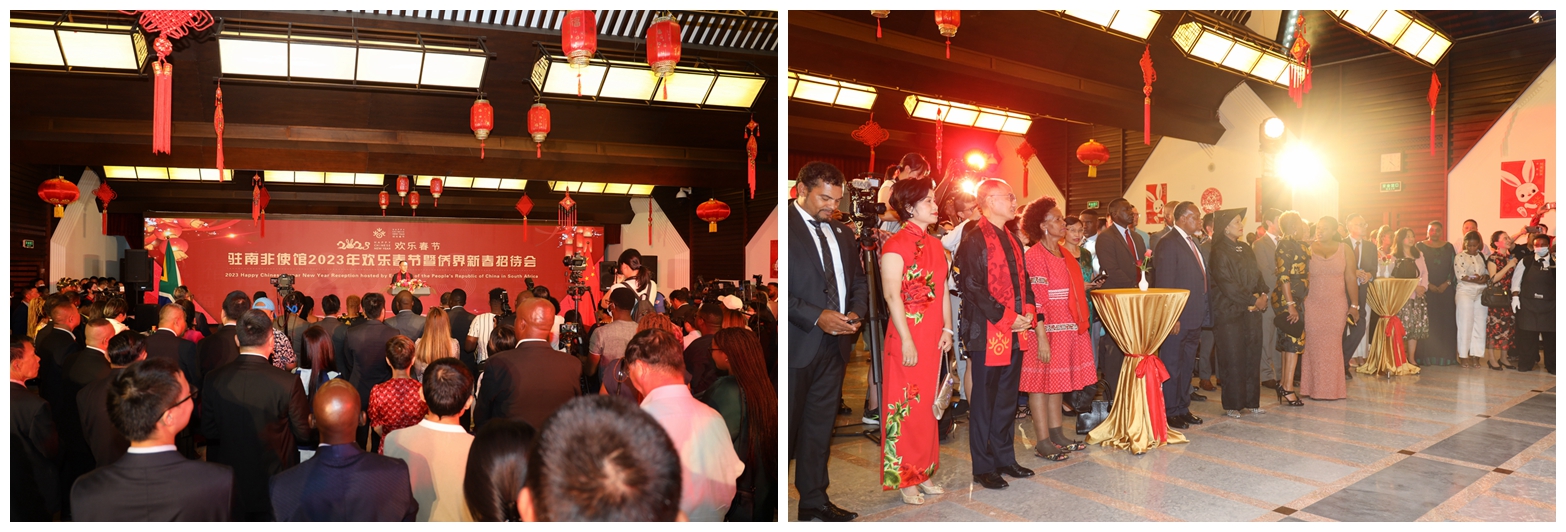2023年1月18日,在中国农历新年兔年来临之际,中国驻南非大使馆举行“2023年欢乐春节暨侨界新春招待会”。陈晓东大使及夫人张斌,南非前总统莫特兰蒂夫妇,基础教育部长莫采卡夫妇,妇女、青年及残障部长马沙巴内,非国大国际关系委员会主席、社会发展部长祖卢,小企业发展部长亚伯拉罕斯,通信和数字技术部长恩特沙韦尼,外交部副部长博特斯,旅南侨界代表、全非洲中国和平统一促进会会长徐长斌等出席并致辞。在南华侨华人、中资机构人员、孔子学院师生和中国留学生代表,南智库学者、媒体记者代表、部分驻南使节以及使馆外交官300多人欢聚一堂,共迎新春。