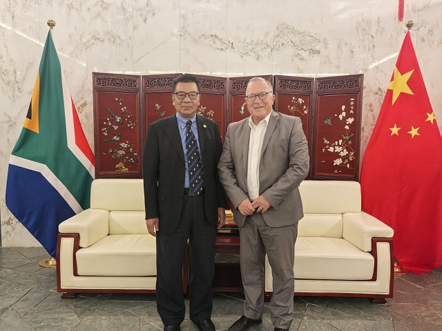 2025年1月14日,尤文泽总领事在馆内会见南非国民议会议程总督导杜格莫尔(Hon. Cameron Muir Dugmore)。