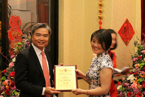 (上图为李立蓓副总领事为区艳球女士颁发荣誉证书)