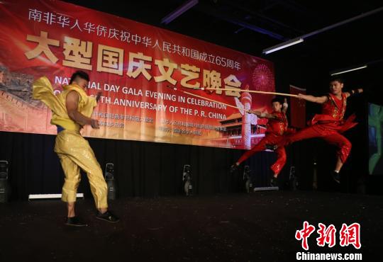9月28日,南非华人华侨在约翰内斯堡皇宫娱乐城大剧院举办文艺晚会,共同庆祝中华人民共和国成立65周年。图为武术表演“双刀对双枪”。 宋方灿 摄