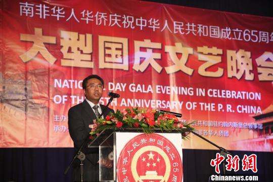 9月28日,南非华人华侨在约翰内斯堡皇宫娱乐城大剧院举办文艺晚会,共同庆祝中华人民共和国成立65周年。图为杨义瑞临时代办致辞。 宋方灿 摄
