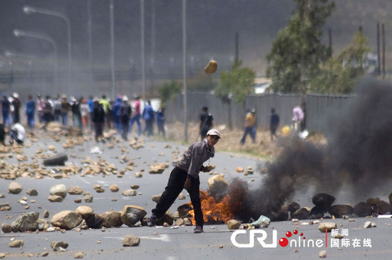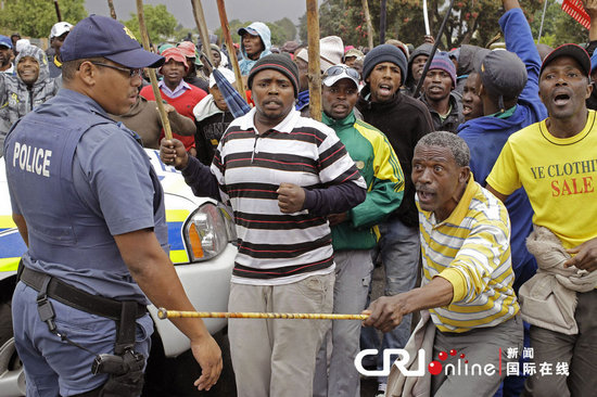 当地时间2013年1月9日,南非Grabouw,农庄工人举行示wei,抗yi工资低廉,并向警察投掷石块,防暴警察为控制冲突,向工人射击橡胶子弹。 图片来源:RODGER BOSCH/东方IC