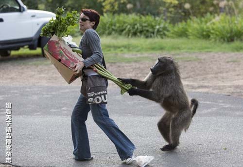 据外媒9月19日报道,在南非开普敦农贸市场外,一女子购物后出来,突然遭遇狒狒无耻的抢劫。现在有近500只狒狒出现在城市里,为了觅食在垃圾堆游荡,现在更是大胆接近商店和市场,窜来窜去抢劫购物的路人。
