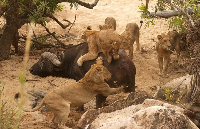事发时,5头年轻的雌狮成功地将一头老水牛从牛群中分离出来,然后在水牛脖子周围又抓又咬,企图给它致命一击。在狮群来势汹汹的围攻之下,水牛被迫跪倒在地,狮群抓住此机会爬上老水牛的背,又是一阵狂抓滥咬。危机时刻,老水牛使出毕生余力做最后一搏,一阵狂跳甩掉背上的狮子,随后跳进身旁的河流,成功脱身。