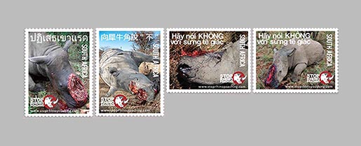 数据显示,中国、越南、泰国是贩卖犀牛角最猖獗的地区。南非保护犀牛公益组织Stop Rhino Poaching为此创办了“犀牛邮票”项目。该项目号召南非民众在寄信时使用特制的“犀牛邮票”,邮票上的犀牛都被残忍切除了犀角,以此呼吁联合每个人的力量抵制犀牛角贸易。