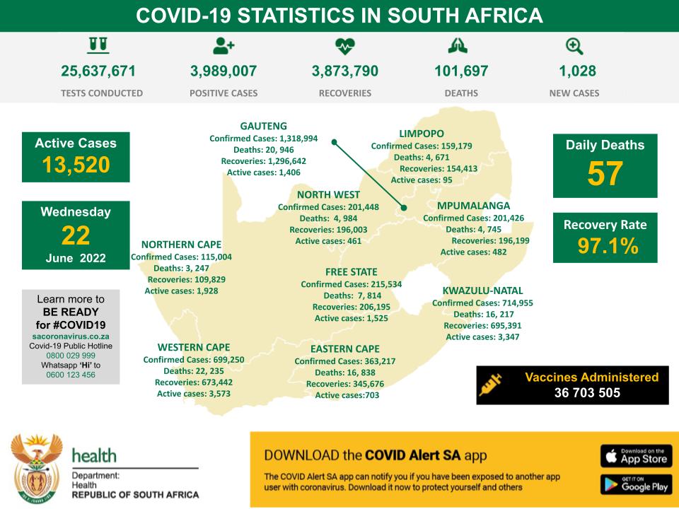 6月22日,南非新冠肺炎新增1028例,累计确诊人数3989007例。新增死亡57例,累计死亡101697例。现有活跃病例13520例,康复率为97.1,累计接种疫苗总数为36703505。
