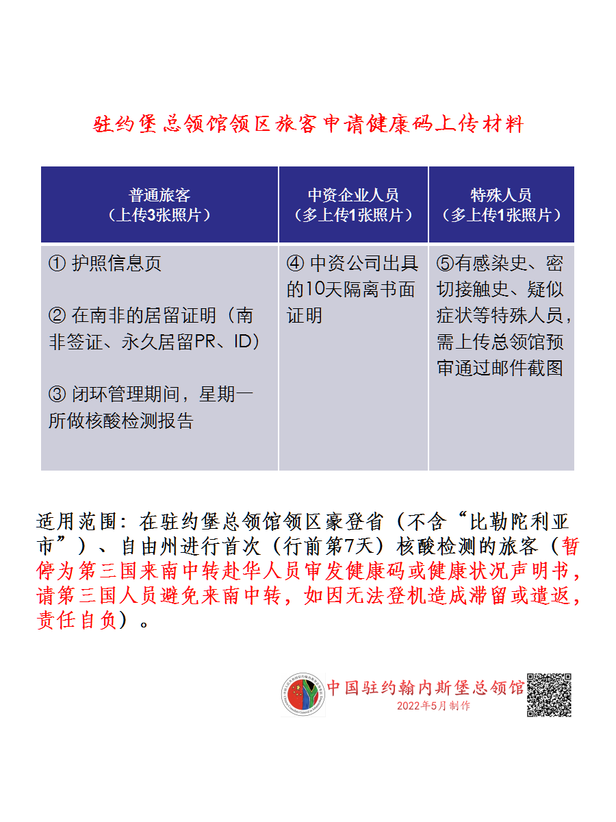 驻开普敦总领馆领区赴华旅客申请健康码所需材料一览表