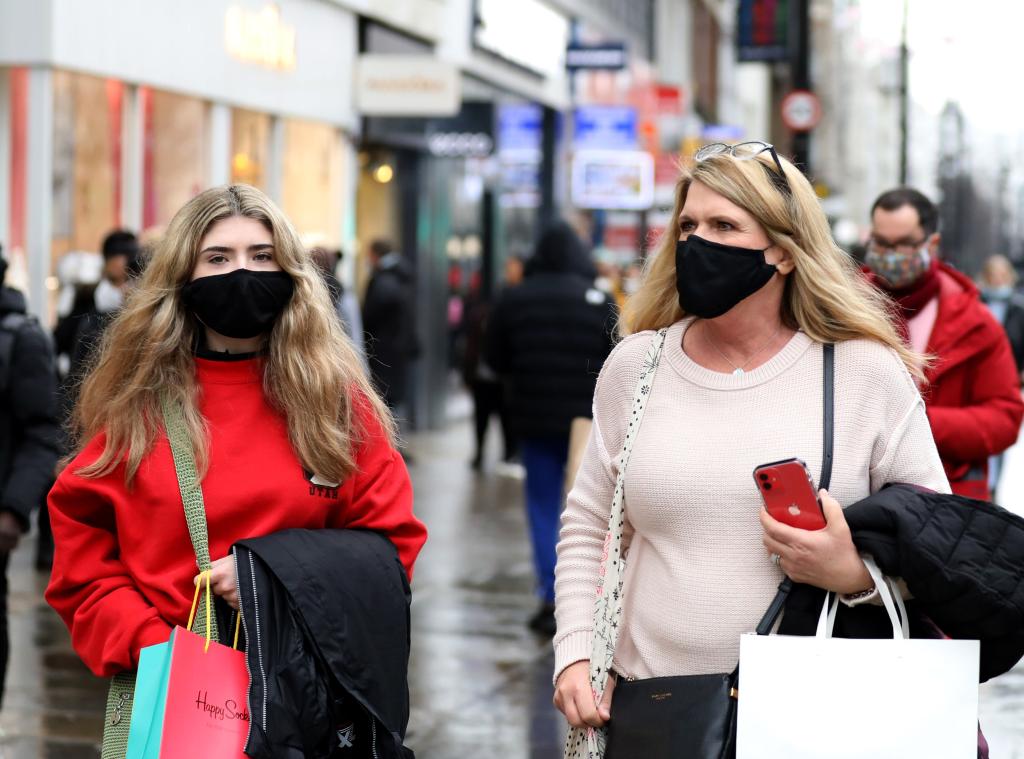 2021年12月26日,人们手提购物袋走在英国伦敦的牛津街上。英国国民保健制度国家医疗事务主任史蒂文·波伊斯警告,随着奥密克戎毒株席卷全国,英国卫生服务已处于“战争状态”。新华社记者 李颖摄