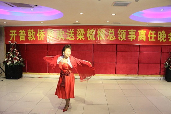 欢送会气氛热烈,侨胞和总领馆工作人员等表演了配乐诗朗诵《送别》、《32式太极剑》、葫芦丝独奏《月光下的凤尾竹》、歌曲《爱拼才会赢》、《上海滩》、舞蹈《红太阳照边疆》、《开普情歌》、《友谊天长地久》等节目,用歌声与舞蹈表达了对梁总夫妇的依依惜别之情。