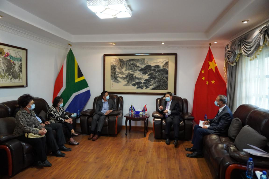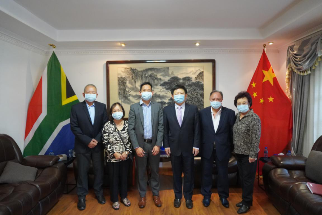 2022年11月29日,唐中东总领事在馆内会见南非杜省中华公会主席潘明怡一行。