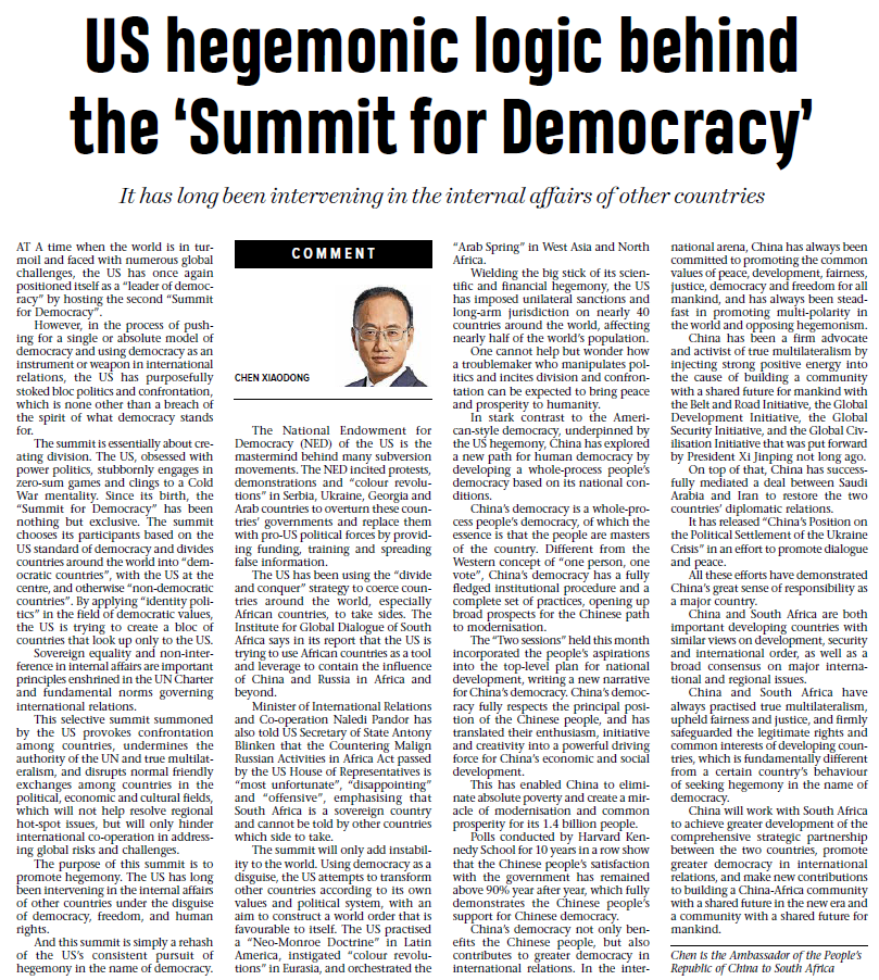 3月24日,驻南非大使陈晓东在南主流媒体《比陀新闻报》《开普时报》《水星报》及独立传媒网站发表题为《警惕民主峰会背后的霸权逻辑》的署名文章,全文如下: