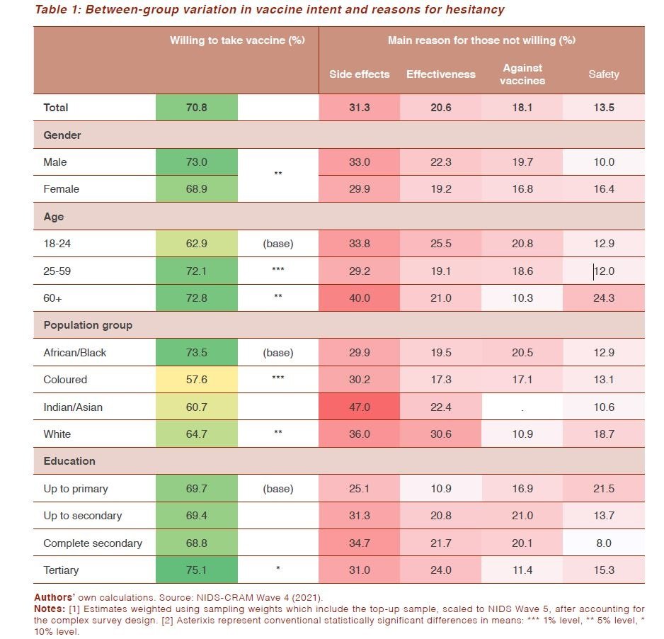 在不同的人口群体和母语为母语的人群中还记录了其他统计上显著的差异,其中有色人种和说Afrikanns语的南非人是最不愿意接种疫苗的。