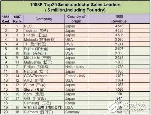 从上表中可以清楚看出,1988年全球的前20位半导体制造商中,11家为日本厂商,美国只占据5家,全球前三更是被日本的日电(NEC)、东芝和日立牢牢占据。